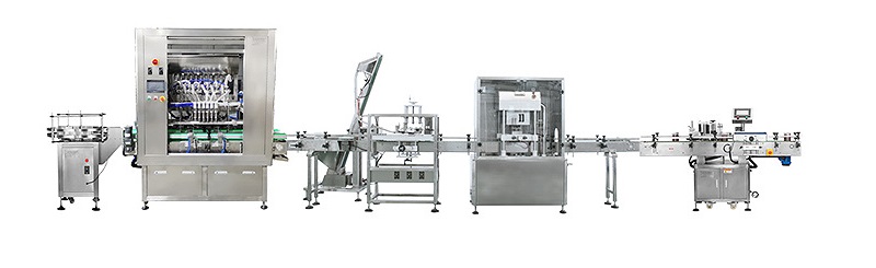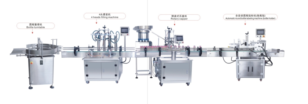 全自動四頭辣椒醬瓶裝灌裝生產(chǎn)線組成:自動理瓶機+四頭自動灌裝機+隔膜泵上料機+全自動旋蓋機+全自動貼標(biāo)機
